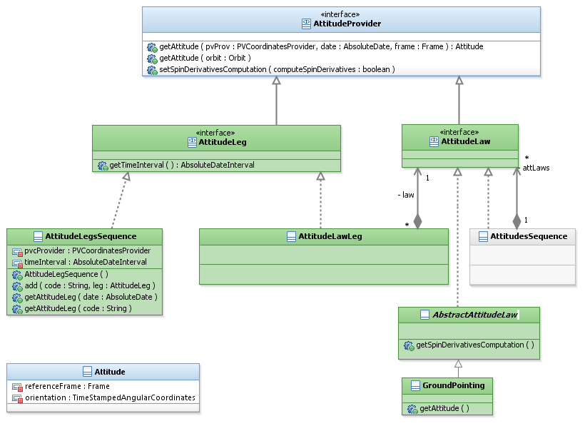 - Several attitude laws are available. These laws were originally designed for orbit determination needs: in order to broaden their applications, a wrapper object has been created to meet the spacecraft attitude field needs.
