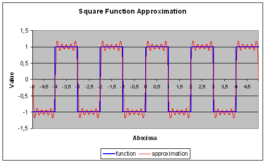 The function and its approximation are shown hereunder. The parasite undulations are known as the Gibbs Phenomenon :