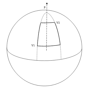 It is defined by three vectors : the local "north pole" vector for this sphere, the min latitude- min longitude point vector (V1) and the max latitude - max longitude point vector (V2).