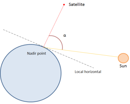 The solar incidence is the angle between the nadir- satellite vector and the nadir - sun vector.