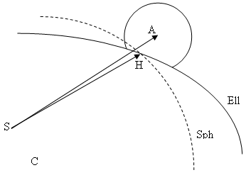 The point on the horizon (H) is calculated as the point of the ellipsoid that is in the same plane as A, C and S (respectively center of occulted body, center of occulting body and satellite). The distance of H to the center C of the ellipsoid is then projected onto a plane orthogonal to the Satellite / Occulting (SA) body direction, and the resulting length is considered as the radius of an "apparent" sphere representing the occulting body. The partial and total eclipse are then computed as per above.