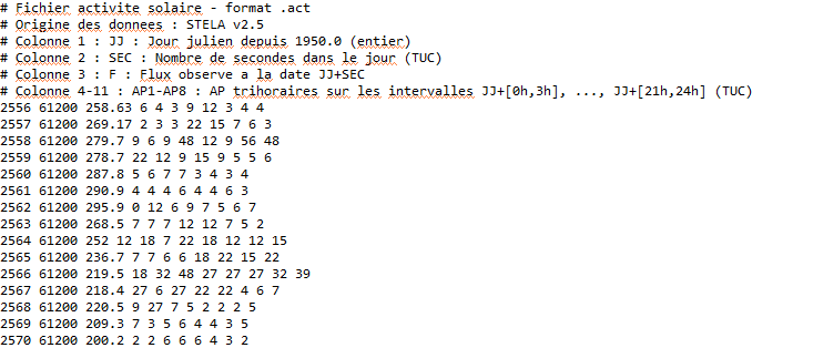 Solar activity contains solar flux and geomagnetic coefficients for a given timespan. ACSOL and NOAA files usually provide data for several years.