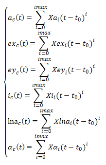 For each circular parameter (a, ex, ey, i, lna, [math]\displaystyle{ \alpha }[/math]), the formula of the trigonometric polynomial part used is: