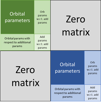 For the case of a MultiOrbitalCovariance for two satellites where both satellites are independent from each other and no additional parameters that are not attached to any orbit are configured, the resulting MultiOrbitalCovariance matrix would look like this (green is for the first satellite, blue is for the second).